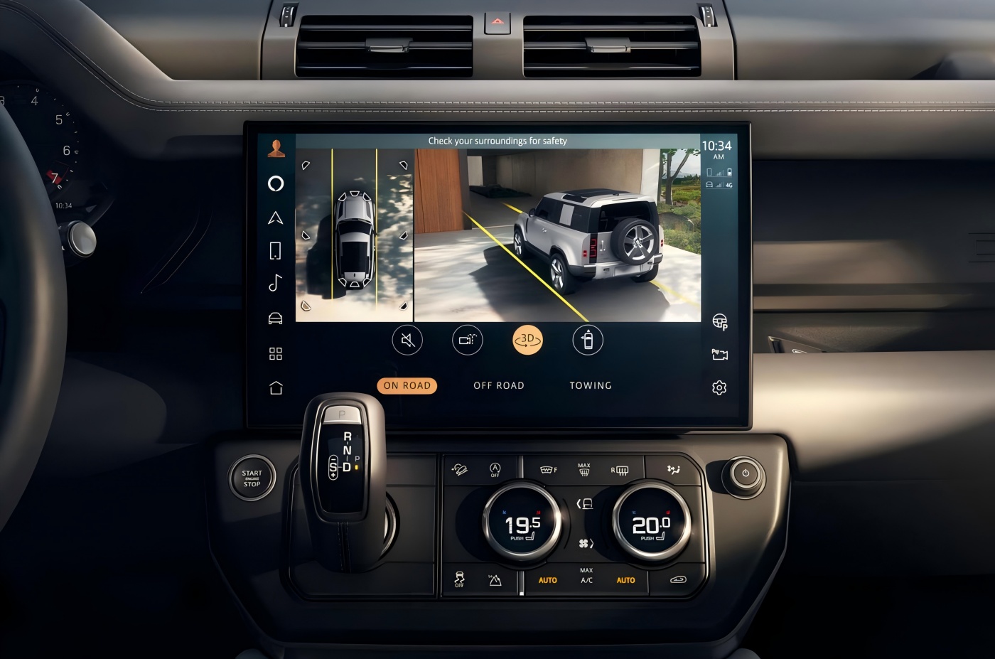 Wnętrze. Jeśli chodzi o wnętrze, ogólny układ nowego pojazdu nie zmienił się zbytnio. Nadal jest wyposażony w tablicę przyrządów wykonaną w całości z ciekłych kryształów i trójramienną, wielofunkcyjną kierownicę. Wyświetlacz multimedialny na środku konsoli środkowej został zmieniony z 11,4 cala na 13,1 cala. Tymczasem w nowym pojeździe dodano system monitorowania kierowcy. Ten system monitorowania jest zgodny z przepisami UE GSR2. Jeśli zostanie wykryte, że kierowca nie zwraca uwagi na drogę przed sobą, uruchomi się alarm dźwiękowy i wideo. Jednakże funkcję wspomagania kierowcy można wyłączyć w opcjach na ekranie konsoli środkowej. Ponadto adaptacyjny tempomat terenowy Land Rovera jest również oferowany po raz pierwszy w Land Rover Defender jako funkcja opcjonalna.